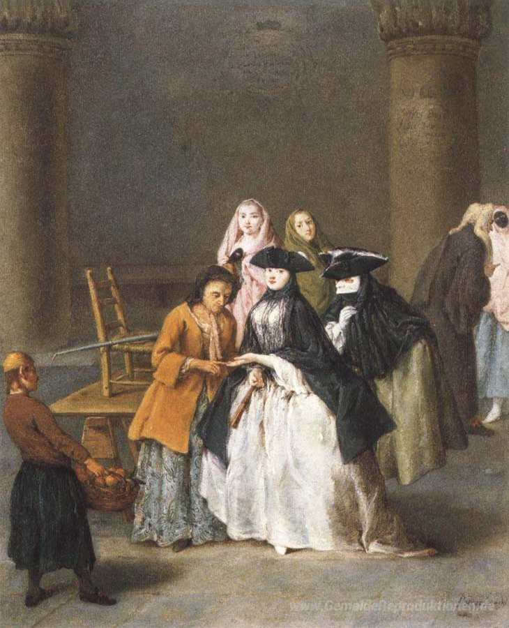 Wir bieten Ihnen eine handgefertigte Reproduktion auf Leinwand des berühmten Kunstwerks 'Eine Wahrsagerin in Venedig' von Pietro Longhi, aus dem Reproduktionsmuseum.