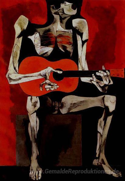 Wir bieten Ihnen eine handgefertigte Reproduktion auf Leinwand des berühmten Kunstwerks 'El Guitarrista' von Oswaldo Guayasamin, aus dem Reproduktionsmuseum.