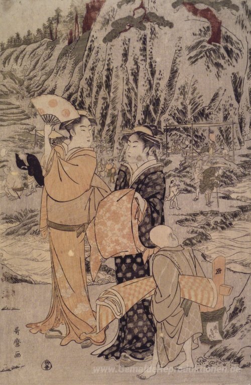 Wir bieten Ihnen eine handgefertigte Reproduktion auf Leinwand des berühmten Kunstwerks 'Entlang der Ufer des Yènoshim' von Kitagawa Utamaro, aus dem Reproduktionsmuseum.