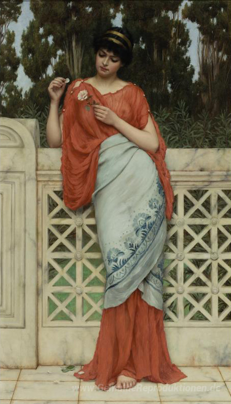 Wir bieten Ihnen eine handgefertigte Reproduktion auf Leinwand des berühmten Kunstwerks 'Er liebt mich, er liebt mich nicht' von John William Godward, aus dem Reproduktionsmuseum.