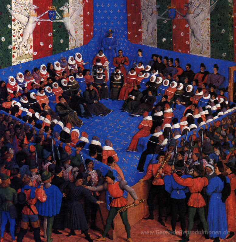 Wir bieten Ihnen eine handgefertigte Reproduktion auf Leinwand des berühmten Kunstwerks 'Fälle von edlen Männer und Frauen' von Jean Fouquet, aus dem Reproduktionsmuseum.