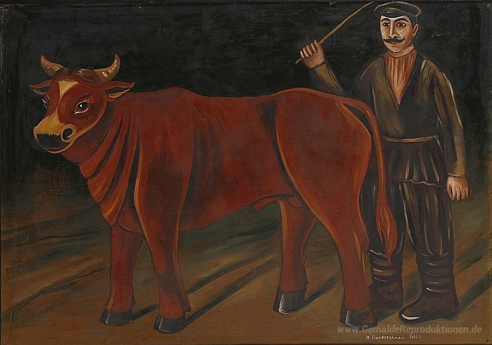 Wir bieten Ihnen eine handgefertigte Reproduktion auf Leinwand des berühmten Kunstwerks 'Farmer mit einem Bull' von Niko Pirosmani, aus dem Reproduktionsmuseum.