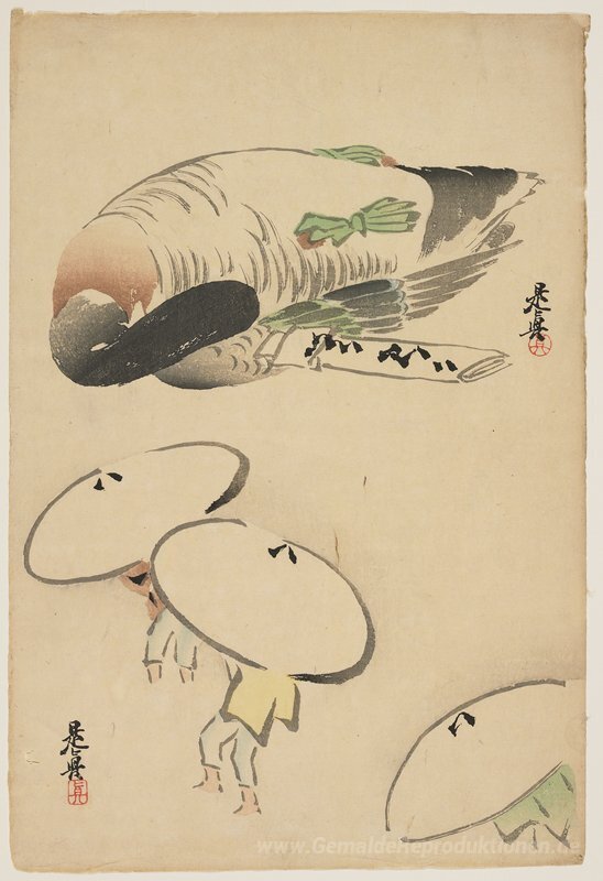 Wir bieten Ihnen eine handgefertigte Reproduktion auf Leinwand des berühmten Kunstwerks 'Fasan / Drei Männer mit Sonnenschirmen' von Shibata Zeshin, aus dem Reproduktionsmuseum.