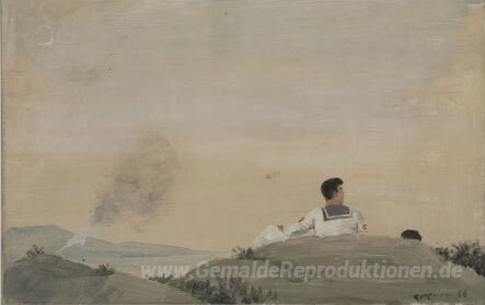 Wir bieten Ihnen eine handgefertigte Reproduktion auf Leinwand des berühmten Kunstwerks 'Felsen mit zwei Matrosen' von Yiannis Tsaroychis, aus dem Reproduktionsmuseum.