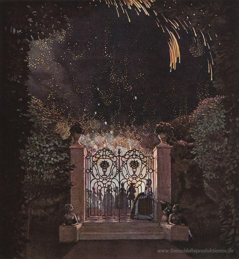 Wir bieten Ihnen eine handgefertigte Reproduktion auf Leinwand des berühmten Kunstwerks 'Feuerwerk im Park' von Konstantin Somov, aus dem Reproduktionsmuseum.
