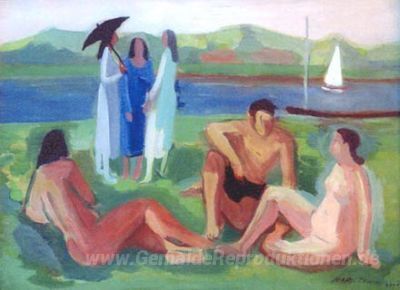 Wir bieten Ihnen eine handgefertigte Reproduktion auf Leinwand des berühmten Kunstwerks 'Figuras kein Tietê' von Mario Zanini, aus dem Reproduktionsmuseum.