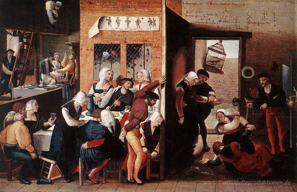 Wir bieten Ihnen eine handgefertigte Reproduktion auf Leinwand des berühmten Kunstwerks 'Fröhliche Gesellschaft' von Jan van Hemessen, aus dem Reproduktionsmuseum.