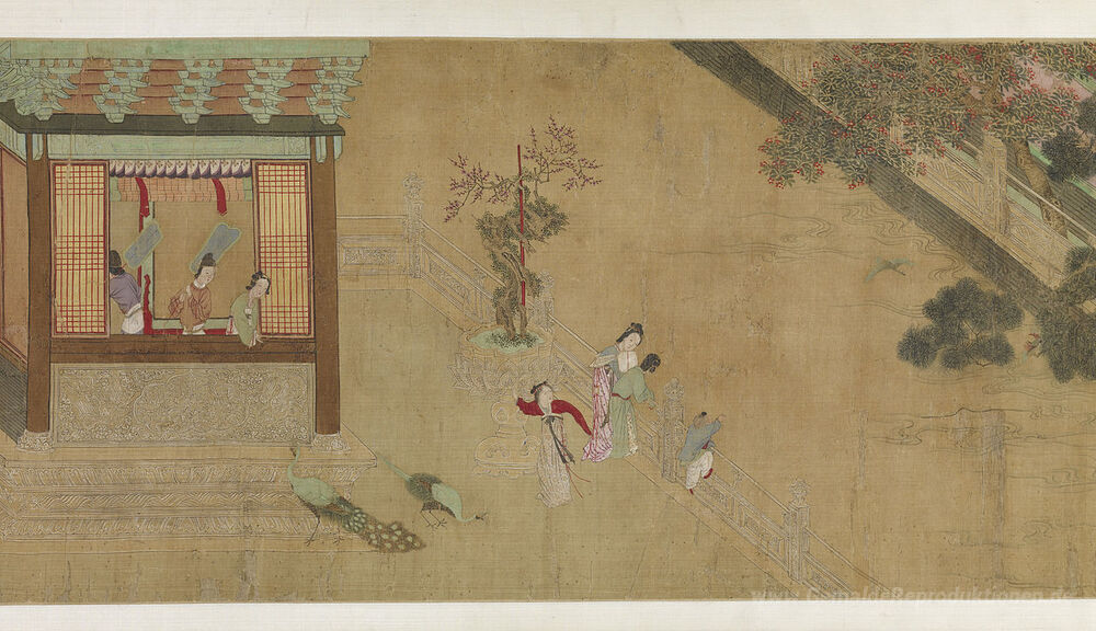 Wir bieten Ihnen eine handgefertigte Reproduktion auf Leinwand des berühmten Kunstwerks 'Frühlings-Morgen im Han-Palast (Ansicht B)' von Qiu Ying, aus dem Reproduktionsmuseum.