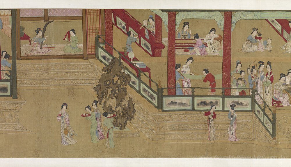 Wir bieten Ihnen eine handgefertigte Reproduktion auf Leinwand des berühmten Kunstwerks 'Frühlings-Morgen im Han-Palast (Ansicht H)' von Qiu Ying, aus dem Reproduktionsmuseum.