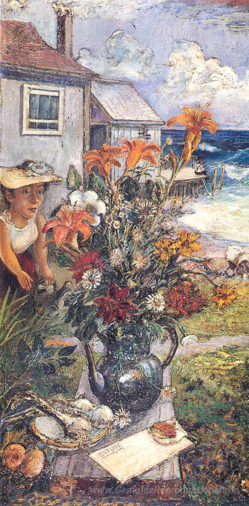 Wir bieten Ihnen eine handgefertigte Reproduktion auf Leinwand des berühmten Kunstwerks 'Frau des Künstlers mit einem Blumenstillleben' von David Burliuk, aus dem Reproduktionsmuseum.