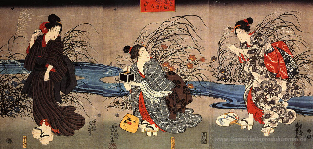 Wir bieten Ihnen eine handgefertigte Reproduktion auf Leinwand des berühmten Kunstwerks 'Frau Glühwürmchen fangen an einem Bach' von Utagawa Kuniyoshi, aus dem Reproduktionsmuseum.