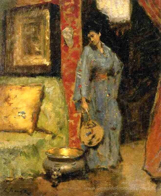 Herzlich willkommen in unserer exquisiten Kollektion von Ölgemälden, wo jedes Kunstwerk eine Geschichte erzählen und Ihre Räumlichkeiten in einzigartige Erlebniswelten verwandeln kann. Eines der herausragenden Stücke in unserem Sortiment ist Frau im Kimono mit einem japanischen Fan, geschaffen von dem renommierten Maler William Merritt Chase. Dieser Meister des Impressionismus verbindet traditionelle europäische Maltechniken mit fernöstlichen Elementen, was dem Werk eine besondere Tiefe und Dynamik verleiht.