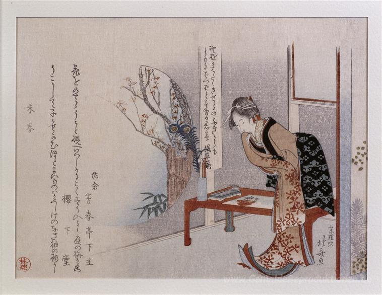 Wir bieten Ihnen eine handgefertigte Reproduktion auf Leinwand des berühmten Kunstwerks 'Frau in einem Innenraum' von Katsushika Hokusai, aus dem Reproduktionsmuseum.