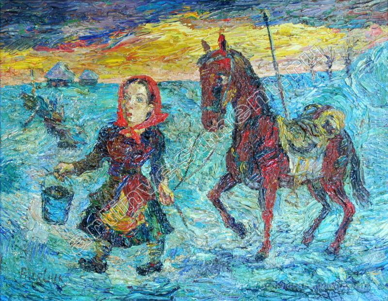Wir bieten Ihnen eine handgefertigte Reproduktion auf Leinwand des berühmten Kunstwerks 'Frau mit einem Pferd' von David Burliuk, aus dem Reproduktionsmuseum.