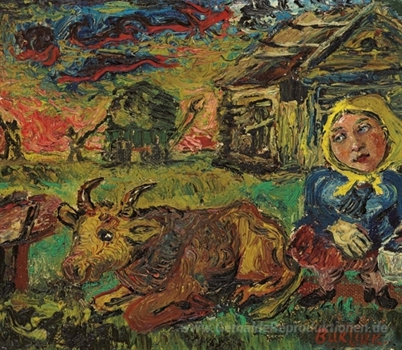 Wir bieten Ihnen eine handgefertigte Reproduktion auf Leinwand des berühmten Kunstwerks 'Frau mit gelbem Schal und Kuh' von David Burliuk, aus dem Reproduktionsmuseum.