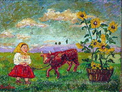 Wir bieten Ihnen eine handgefertigte Reproduktion auf Leinwand des berühmten Kunstwerks 'Frau mit roten Kuh' von David Burliuk, aus dem Reproduktionsmuseum.