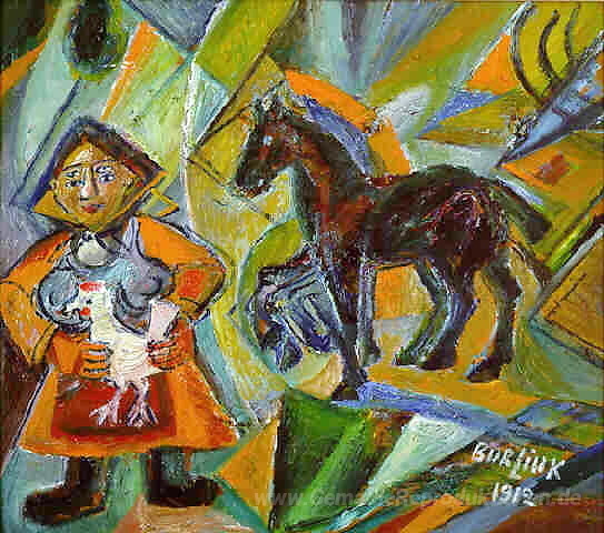 Wir bieten Ihnen eine handgefertigte Reproduktion auf Leinwand des berühmten Kunstwerks 'Frau mit vier Augen und Henne' von David Burliuk, aus dem Reproduktionsmuseum.