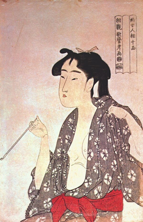 Wir bieten Ihnen eine handgefertigte Reproduktion auf Leinwand des berühmten Kunstwerks 'Frau Rauchen' von Kitagawa Utamaro, aus dem Reproduktionsmuseum.