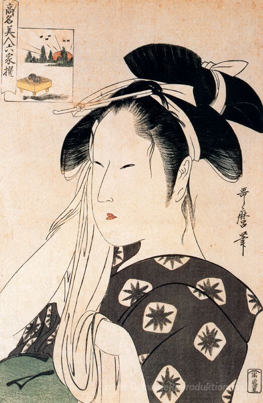 Wir bieten Ihnen eine handgefertigte Reproduktion auf Leinwand des berühmten Kunstwerks 'Frau spielt eine poppin' von Kitagawa Utamaro, aus dem Reproduktionsmuseum.