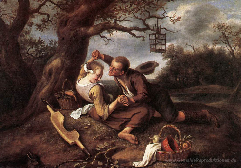 Wir bieten Ihnen eine handgefertigte Reproduktion auf Leinwand des berühmten Kunstwerks 'Frohe Paare' von Jan Steen, aus dem Reproduktionsmuseum.