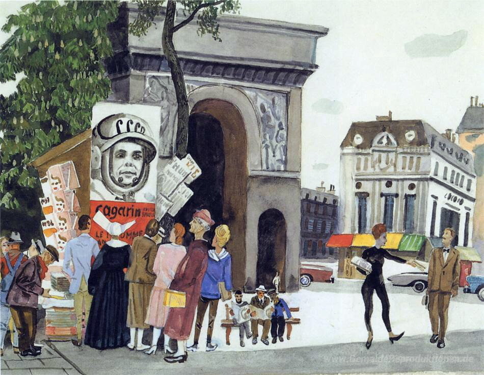 Wir bieten Ihnen eine handgefertigte Reproduktion auf Leinwand des berühmten Kunstwerks 'Gagarins Tag in Paris' von Aleksandr Deyneka, aus dem Reproduktionsmuseum.