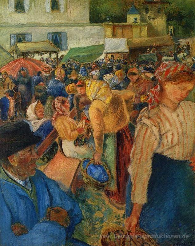 Wir bieten Ihnen eine handgefertigte Reproduktion auf Leinwand des berühmten Kunstwerks 'Geflügel vermarkten, Pontoise' von Camille Pissarro, aus dem Reproduktionsmuseum.