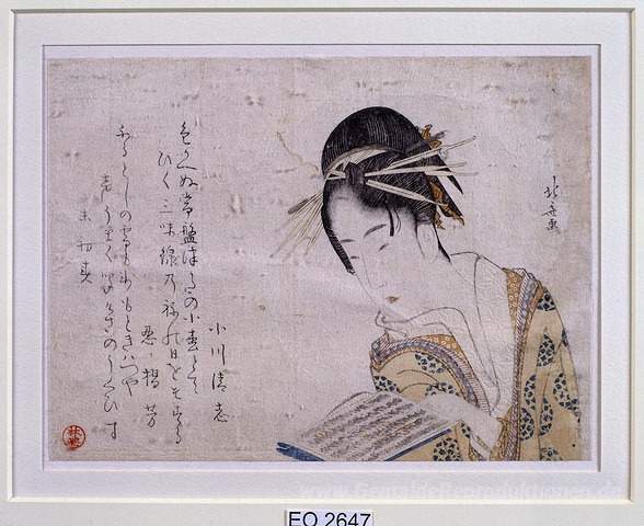 Wir bieten Ihnen eine handgefertigte Reproduktion auf Leinwand des berühmten Kunstwerks 'Geisha ein Buch zu lesen' von Katsushika Hokusai, aus dem Reproduktionsmuseum.
