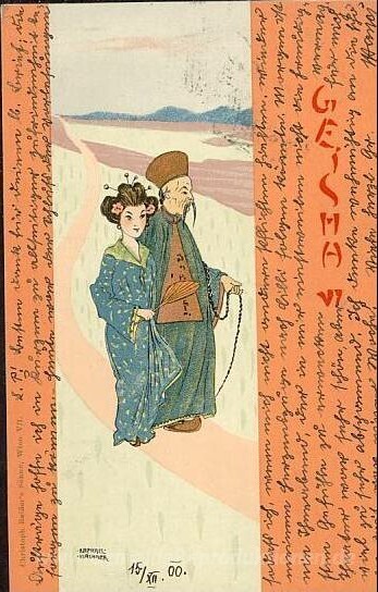 Wir bieten Ihnen eine handgefertigte Reproduktion auf Leinwand des berühmten Kunstwerks 'Geisha' von Raphael Kirchner, aus dem Reproduktionsmuseum.
