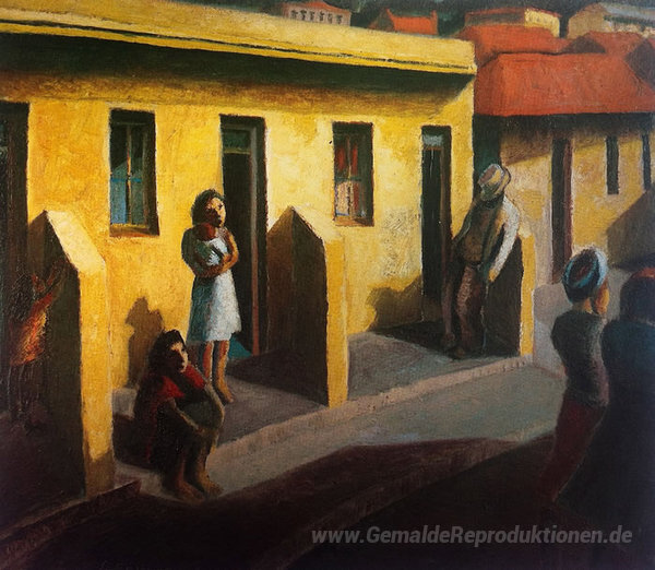 Wir bieten Ihnen eine handgefertigte Reproduktion auf Leinwand des berühmten Kunstwerks 'Gelbe Häuser: District Six' von Gerard Sekoto, aus dem Reproduktionsmuseum.