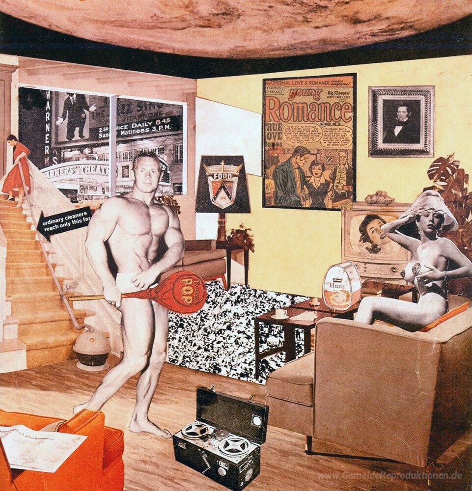 Wir bieten Ihnen eine handgefertigte Reproduktion auf Leinwand des berühmten Kunstwerks 'Genau das, was ist es, dass die heutigen Wohnungen eigentlich so' von Richard Hamilton, aus dem Reproduktionsmuseum.
