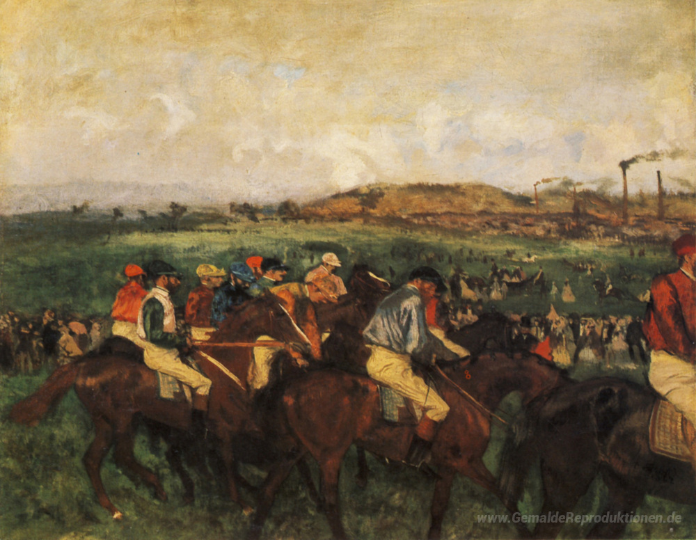 Wir bieten Ihnen eine handgefertigte Reproduktion auf Leinwand des berühmten Kunstwerks 'Gentlemen Jockeys vor dem Start-' von Edgar Degas, aus dem Reproduktionsmuseum.