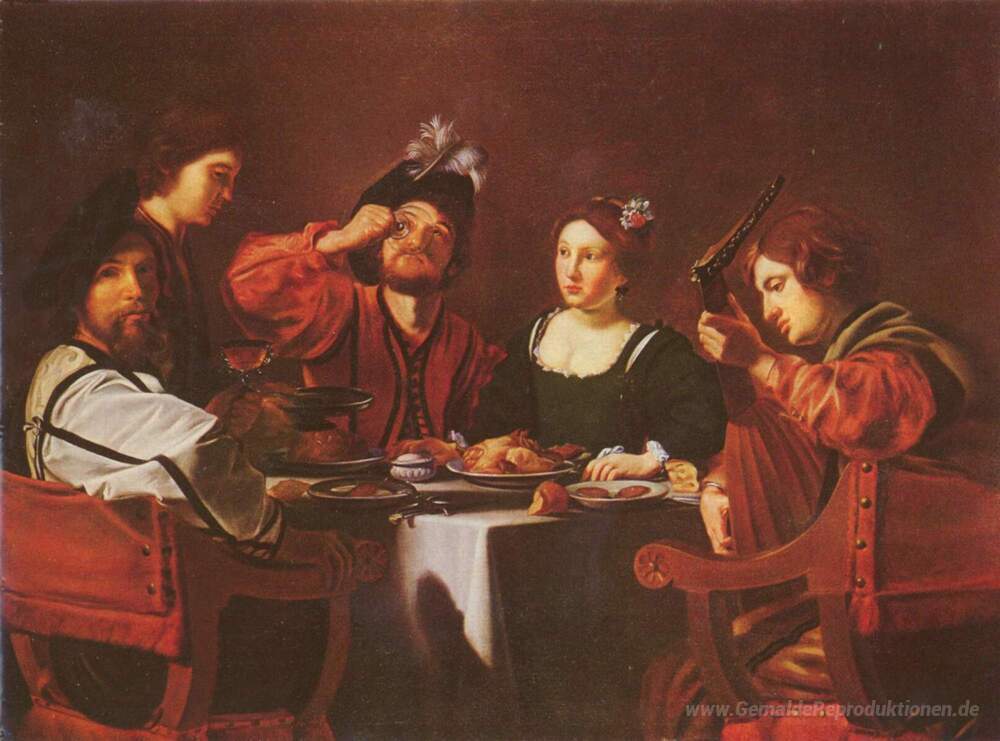 Wir bieten Ihnen eine handgefertigte Reproduktion auf Leinwand des berühmten Kunstwerks 'Gesellschaft bei Tisch' von Nicolas Tournier, aus dem Reproduktionsmuseum.