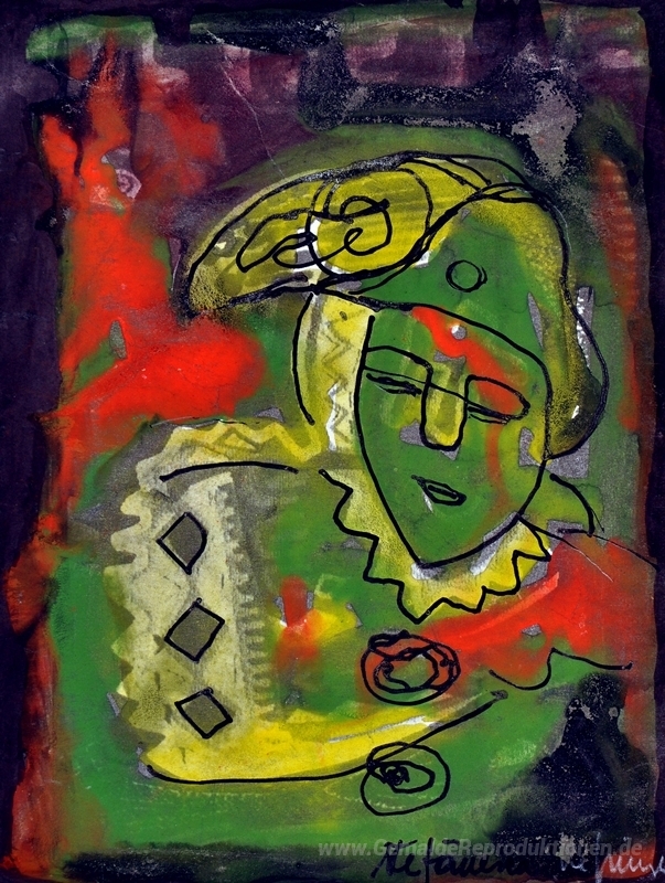 Wir bieten Ihnen eine handgefertigte Reproduktion auf Leinwand des berühmten Kunstwerks 'Grün Harlequin' von George Stefanescu-Ramnic , aus dem Reproduktionsmuseum.