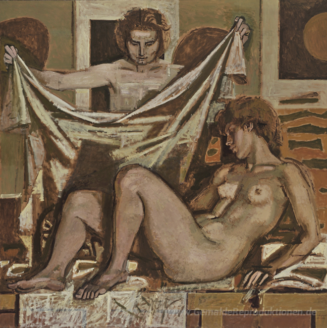 Wir bieten Ihnen eine handgefertigte Reproduktion auf Leinwand des berühmten Kunstwerks 'Grab Komposition I' von Yiannis Moralis, aus dem Reproduktionsmuseum.