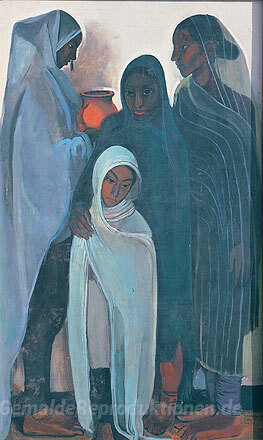 Wir bieten Ihnen eine handgefertigte Reproduktion auf Leinwand des berühmten Kunstwerks 'Hill Frauen' von Amrita Sher-Gil, aus dem Reproduktionsmuseum.