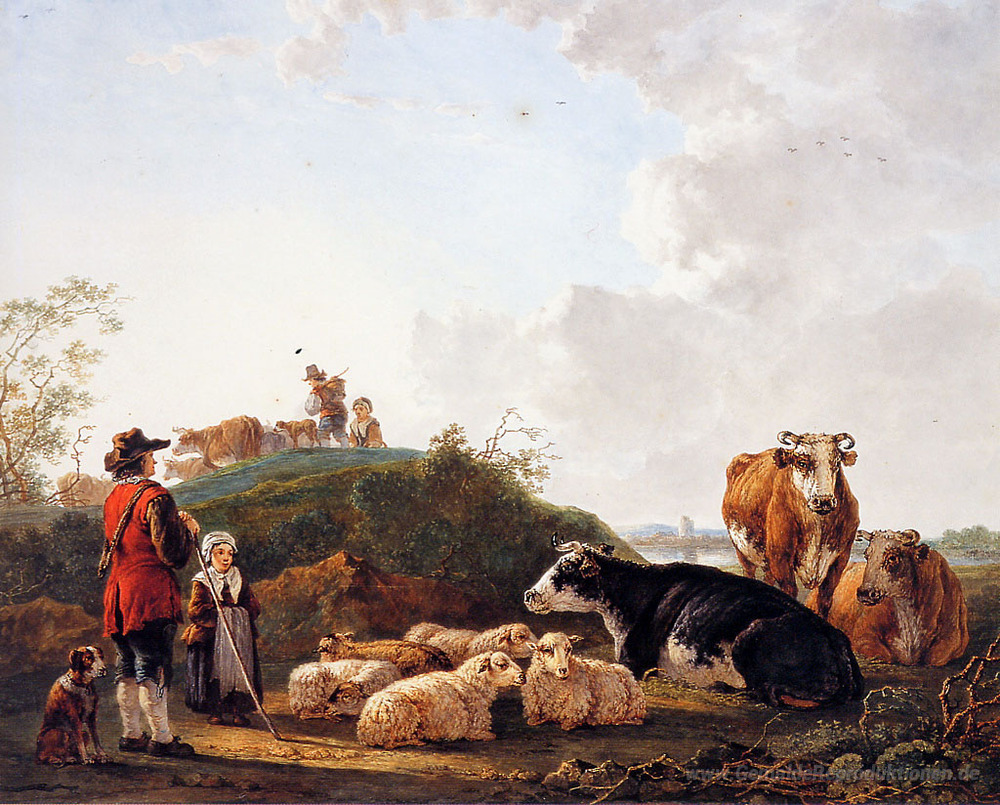 Wir bieten Ihnen eine handgefertigte Reproduktion auf Leinwand des berühmten Kunstwerks 'Hirt mit ruhenden Rindern' von Jacob van Strij, aus dem Reproduktionsmuseum.