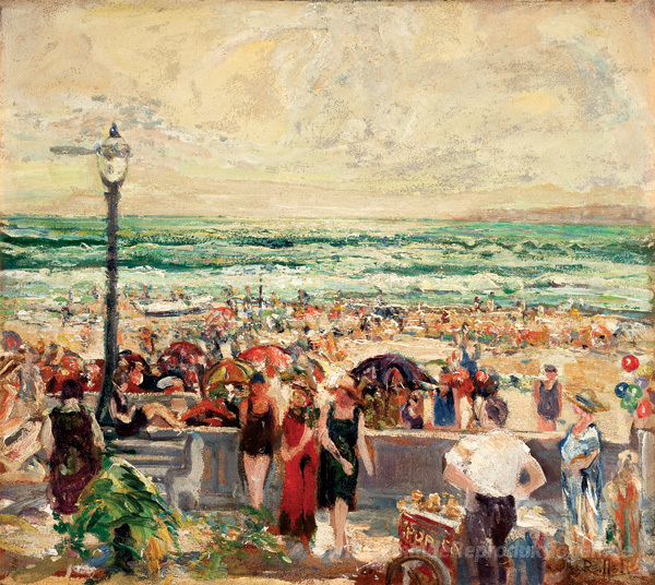 Wir bieten Ihnen eine handgefertigte Reproduktion auf Leinwand des berühmten Kunstwerks 'Holiday, Mission Beach' von Charles Reiffel, aus dem Reproduktionsmuseum.
