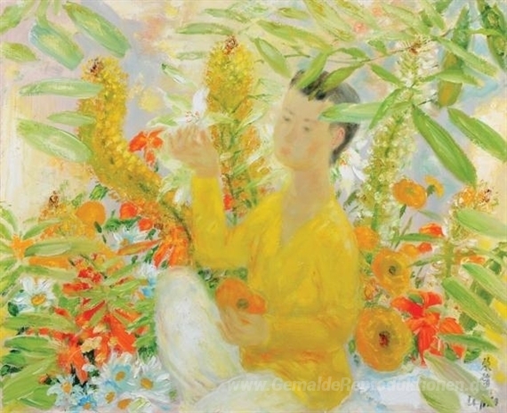 Wir bieten Ihnen eine handgefertigte Reproduktion auf Leinwand des berühmten Kunstwerks 'Im Garten' von Le Pho, aus dem Reproduktionsmuseum.