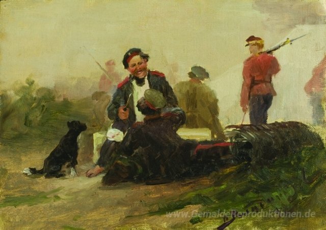 Wir bieten Ihnen eine handgefertigte Reproduktion auf Leinwand des berühmten Kunstwerks 'Im Militärlager. Etüde.' von Ivan Vladimirov, aus dem Reproduktionsmuseum.