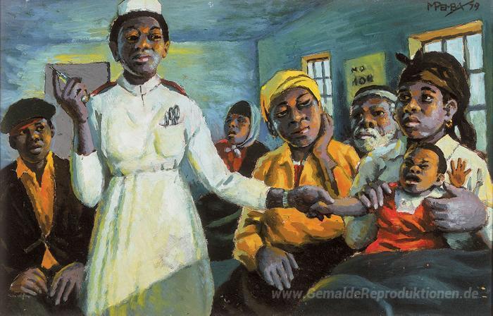 Wir bieten Ihnen eine handgefertigte Reproduktion auf Leinwand des berühmten Kunstwerks 'In der Klinik' von George Pemba, aus dem Reproduktionsmuseum.