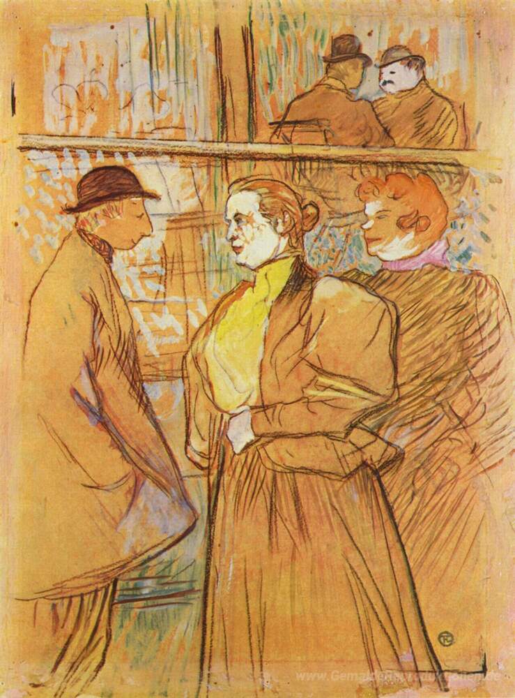 Wir bieten Ihnen eine handgefertigte Reproduktion auf Leinwand des berühmten Kunstwerks 'In Moulin Rouge' von Henri de Toulouse-Lautrec, aus dem Reproduktionsmuseum.