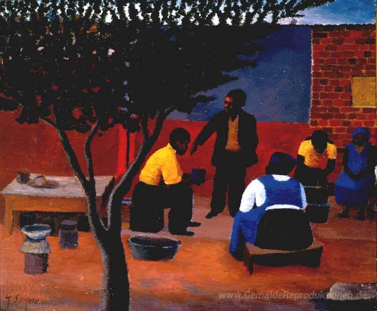 Wir bieten Ihnen eine handgefertigte Reproduktion auf Leinwand des berühmten Kunstwerks 'Indaba' von Gerard Sekoto, aus dem Reproduktionsmuseum.
