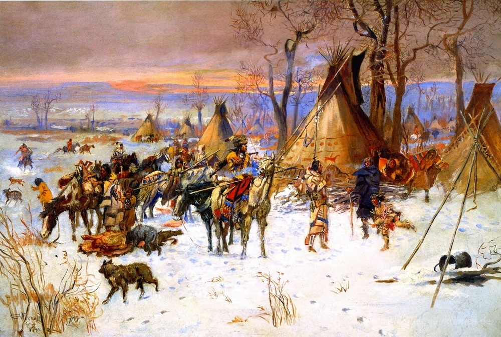 Wir bieten Ihnen eine handgefertigte Reproduktion auf Leinwand des berühmten Kunstwerks 'Indian Hunters 'Return' von Charles M. Russell, aus dem Reproduktionsmuseum.