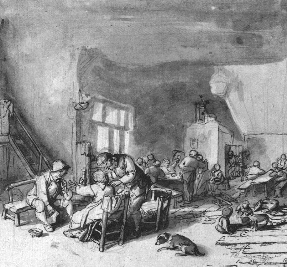 Wir bieten Ihnen eine handgefertigte Reproduktion auf Leinwand des berühmten Kunstwerks 'Innenraum eines Gasthauses' von Adriaen van Ostade, aus dem Reproduktionsmuseum.