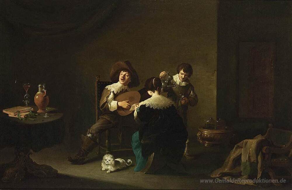 Wir bieten Ihnen eine handgefertigte Reproduktion auf Leinwand des berühmten Kunstwerks 'Innenraum mit einem Gentleman Abspielen einer Laute und eine Lad' von David Teniers the Younger, aus dem Reproduktionsmuseum.