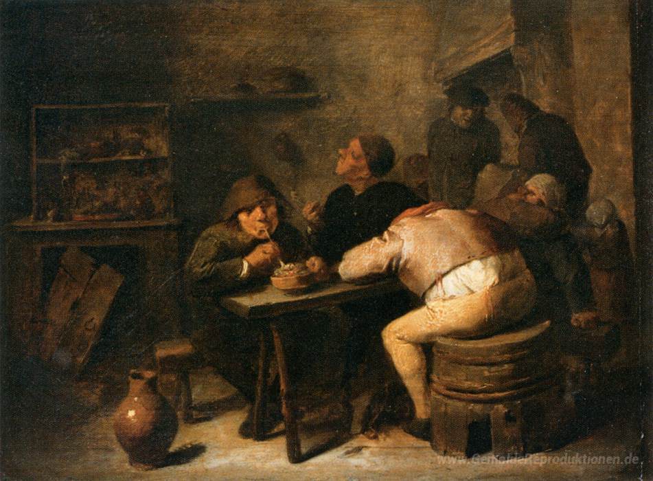 Wir bieten Ihnen eine handgefertigte Reproduktion auf Leinwand des berühmten Kunstwerks 'Innenraum mit Rauchern' von Adriaen Brouwer, aus dem Reproduktionsmuseum.