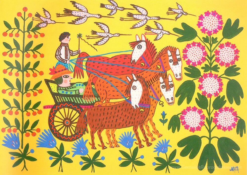 Wir bieten Ihnen eine handgefertigte Reproduktion auf Leinwand des berühmten Kunstwerks 'Ivan gab dem Vermieter eine Fahrt in seinem Gig und Fell Innen' von Maria Primachenko, aus dem Reproduktionsmuseum.
