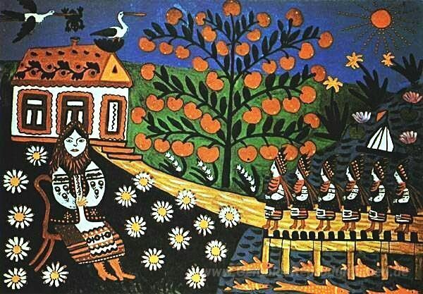 Wir bieten Ihnen eine handgefertigte Reproduktion auf Leinwand des berühmten Kunstwerks 'Jahre meiner Jugend, mich besuchen kommen' von Maria Primachenko, aus dem Reproduktionsmuseum.
