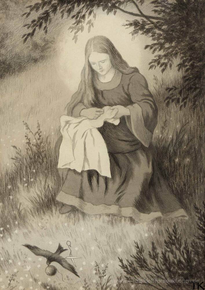 Wir bieten Ihnen eine handgefertigte Reproduktion auf Leinwand des berühmten Kunstwerks 'Jungfer Maria Og Svalen' von Theodor Severin Kittelsen, aus dem Reproduktionsmuseum.