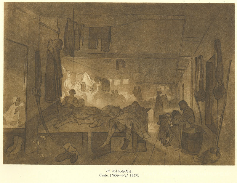 Wir bieten Ihnen eine handgefertigte Reproduktion auf Leinwand des berühmten Kunstwerks 'Kaserne' von Taras Shevchenko, aus dem Reproduktionsmuseum.